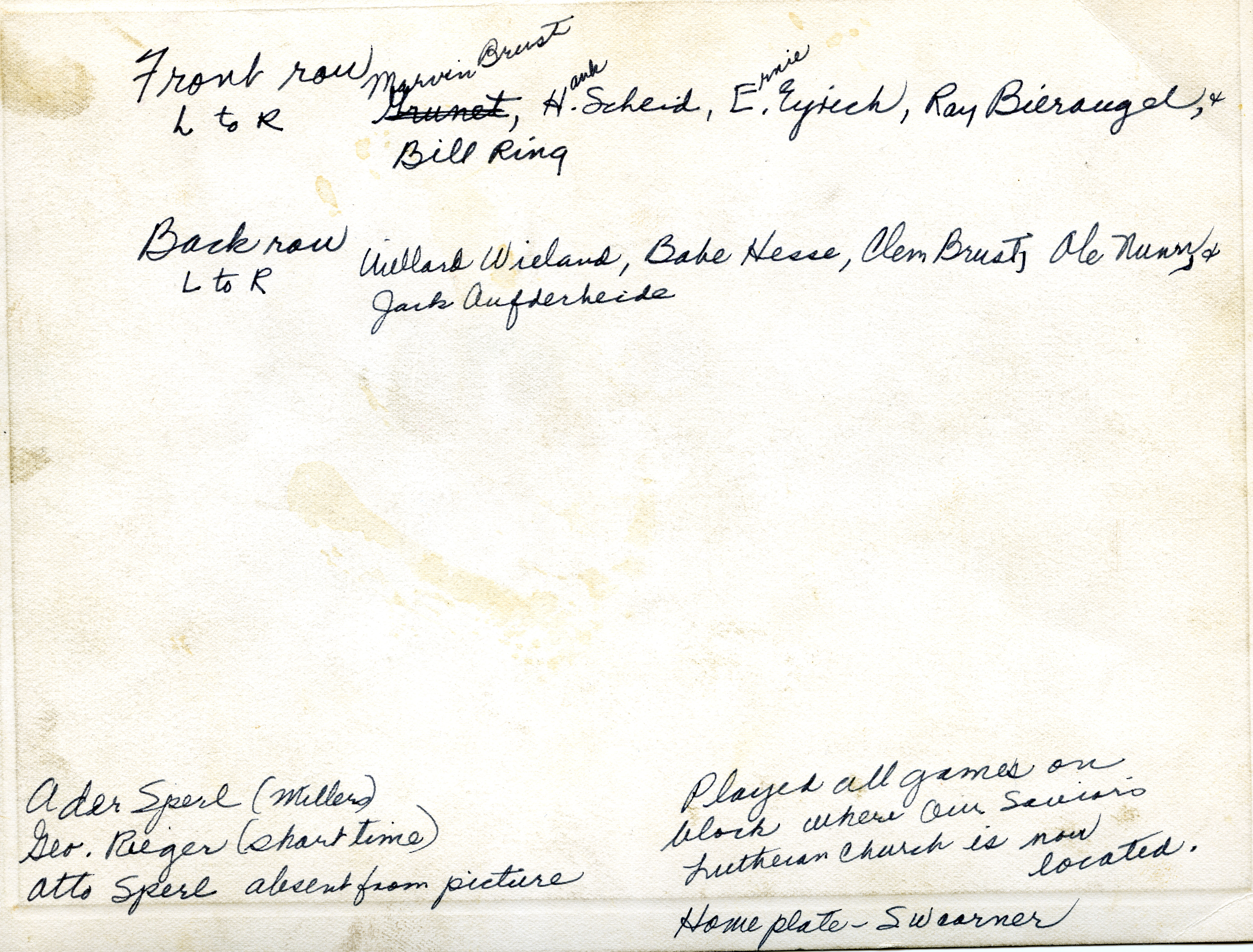 Image # 3592 - Rambler Baseball team identification,team from Aufderheide collection Identification of New Ulm Ramblers who played on south end of New Ulm in the 1930's. Listed on back side of photograph. See Object ID # 3585 for thumbnail. Refer to index for identification. |