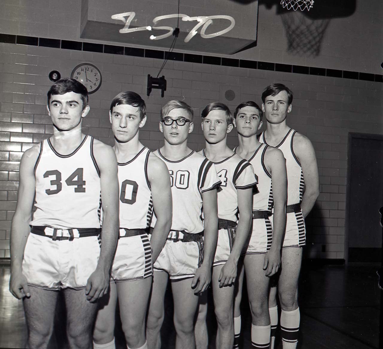 Image # 2570 - 1966-1967 New Ulm Cathedral basketball 120 mm negatives of 1967-1968 Cathedral basketball team. Includes candid photo of group of six players including, left tor right: Russ Broich, Bob Weier, Tom Arndt, Gary Neumann, Mike Ubl, Rick Schow. Also see other objects number 2443 and 2569. |