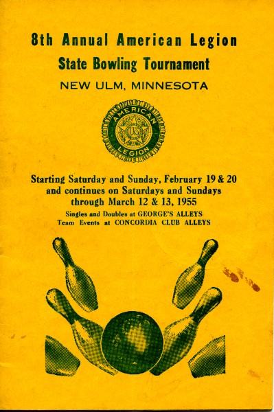 Image # 1648 - 1955 State American Legion bowling tournament program Minnesota state American Legion bowling tournament program and schedules for tournament held in New Ulm 1958. Team events held at Concordia Club, State Street, and individual doubles and singles at George's. Participants listed in program. |
