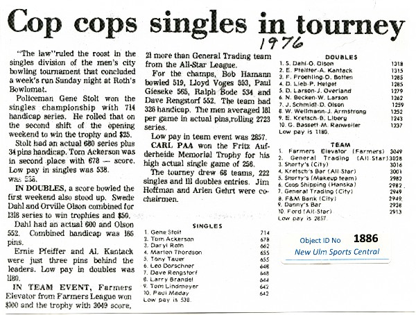 Image # 1886 - 1976 Men's City Association tournament at George's New Ulm Journal write-up of 1976 tournament in which Gene Stolt was the singles champion with a 714 with handicap score. Farmers Elevator from the Farmers League won the team title with a 3049 result. Doubles honors went to Swede Dahl and Orville Olson for their 1,318 series. Carl Paa received the Fritz Aufderheid... (Click on the image for a full description) |