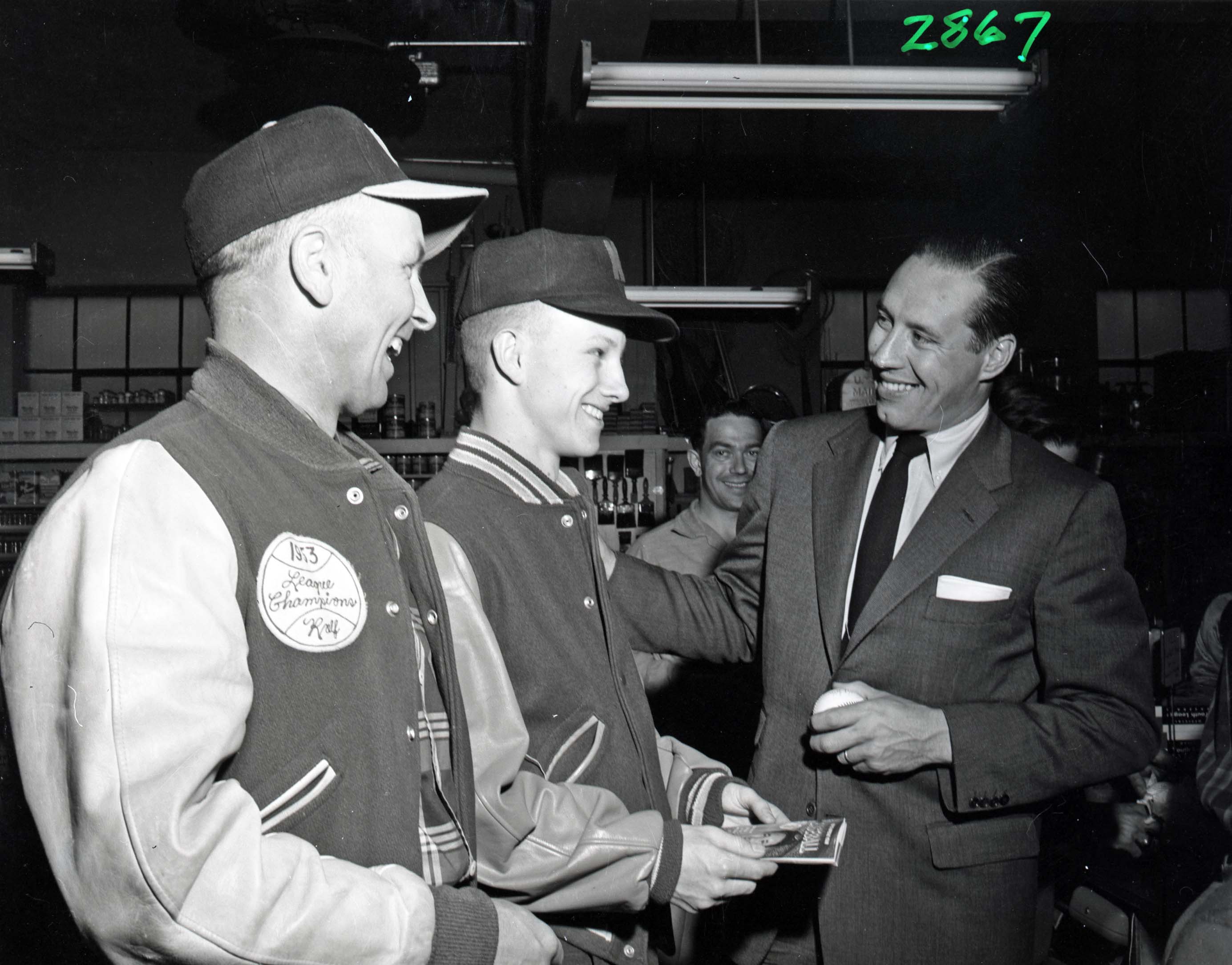 Image # 2867 - 1957 Major League pitcher Bob Feller come to New Ulm Former major league standout Bob Feller appeared in New Ulm in 1957 and visited here with several area baseball people. L-R: Rolf Nackerud, Walnut Grove and Dave Bjorkland, Winthrop. |