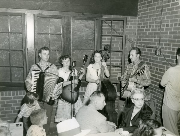 Image # 1715 - Circa 1950's KNUJ or New Ulm Journal company picnic at Flandrau State Park featuring Trail Riders band A combined New Ulm Journal-KNUJ picnic was held at Flandrau State Park in the 1950's, likely for an anniversary observance of KNUJ. Providing entertainment was a number of the Trail Riders musical group including, left to right, Stan Carda, Lindy Kramer (later Mr.s Carda), Patty Wiegman (sp) and ? unidentified guitar ... (Click on the image for a full description) |