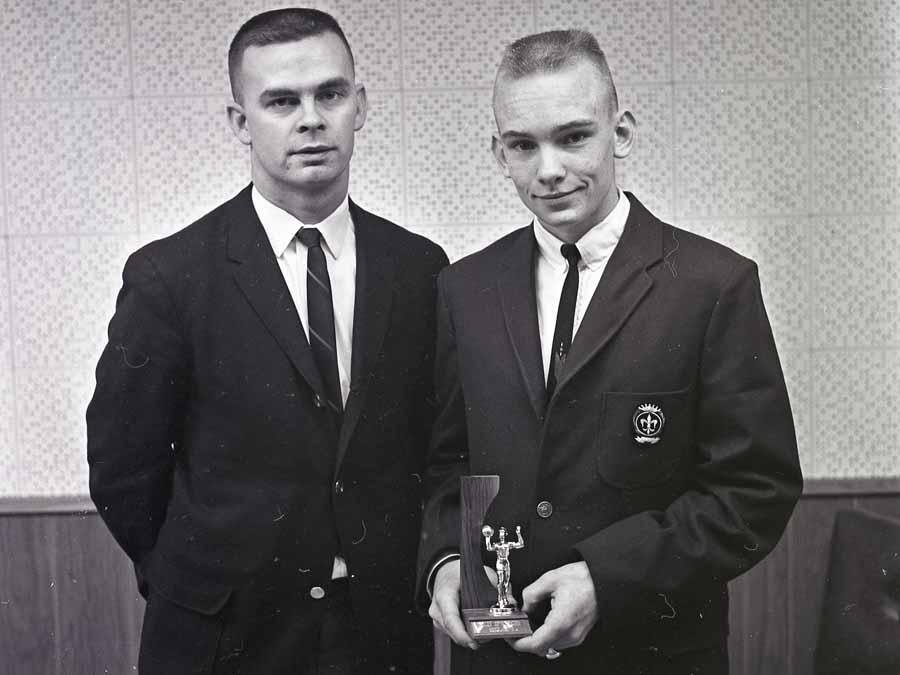 Image # 2233 - 1964 New Stewart Gym Opening and 212 Jamboree with Coaches Among Coaches and players participating in 1964 first game at Stewart new gym. Two poses of smae coach and player. |