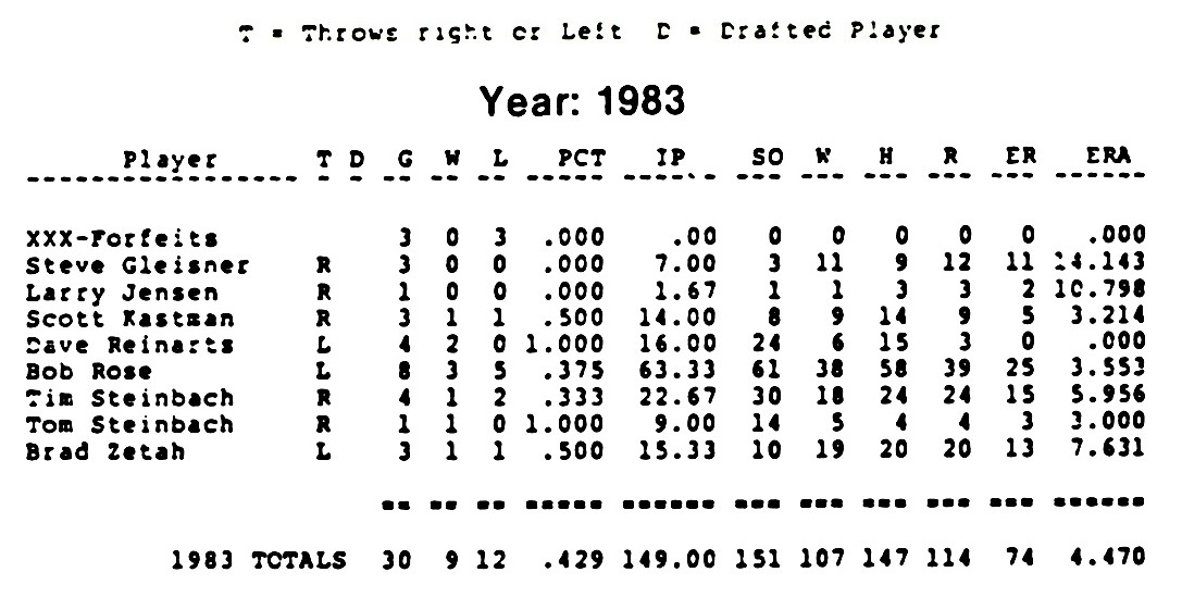Image # 4565 - 1983 New Ulm Kaiserhoff season pitching stats Annual individual player pitching data in typeset-ready quality for Kaiserhoff baseball starting in 1969. Originally prepared as material Vol. I of New Ulm's baseball history. Hard copy file ready for scanning to digital record. Corresponding season summaries and batting stats are also available. Paste-ups for fur... (Click on the image for a full description) |