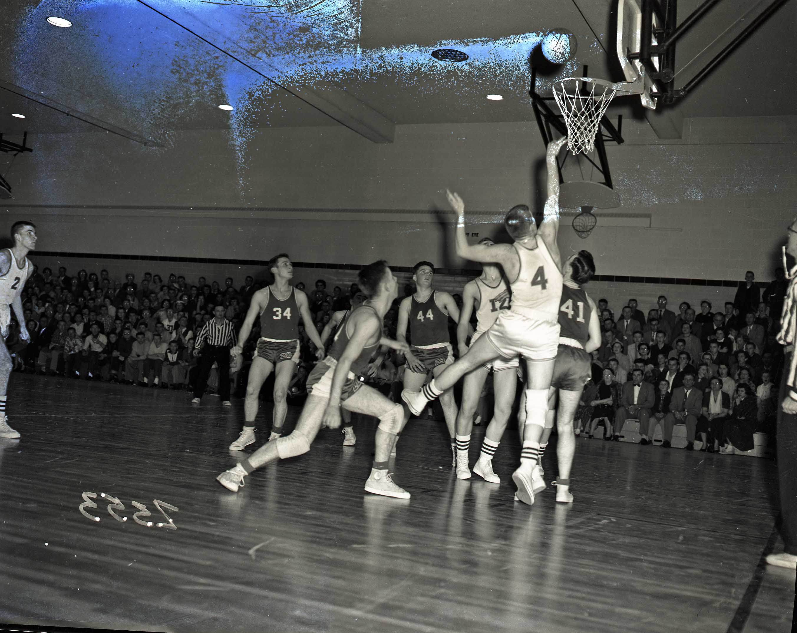 Image # 2353 - 1954 Region Seven Catholic basketball tournament. Sleepy Eye St. Mary's vs New Ulm Holy Trinity Basketball Action photo from Region 7 Catholic basketball tournament in 1954 shows Jerry Fesenmaier (4) of New Ulm shooting. Others pictured include Tom Hentges (41) of sleepy Eye, Ed Weber (12) New Ulm, Dick Hentges (44) Sleepy Eye and Dennis Stoneberg (34) Sleepy Eye. |