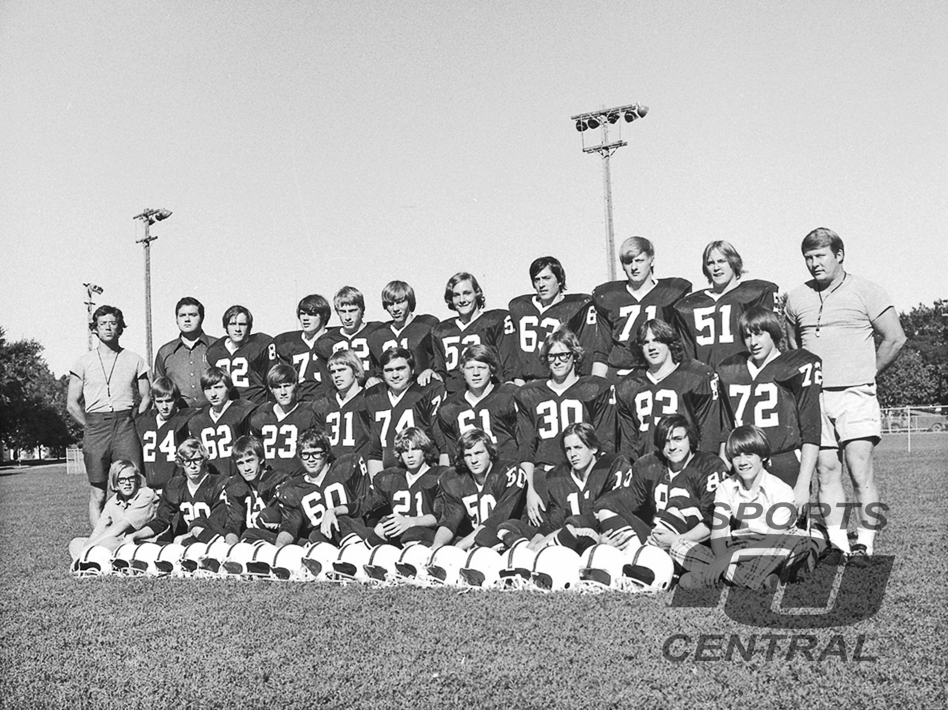 Image # 4444 - 1973 Cathedral High School Football Team 1973 football team for New Ulm Cathedral High School with coach John Mowan. Identification desired. Several versions of picture processed by Elroy Ubl after researching negatives entrusted to New Ulm Sports Central. |