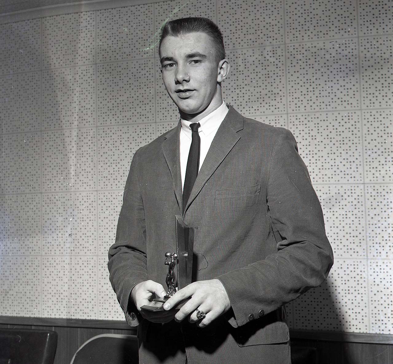 Image # 2573 - 1963-1964 New Ulm Cathedral basketball standout Tom Herbeck 120 mm negatives of 1963-1964 Cathedral basketball team candid photos of group of individual with trophy award. That's Tom Herbeck. Additional Candid photos with some individuals located and team picture may be found in objects: 2444,2571, 2572, and 2574 |