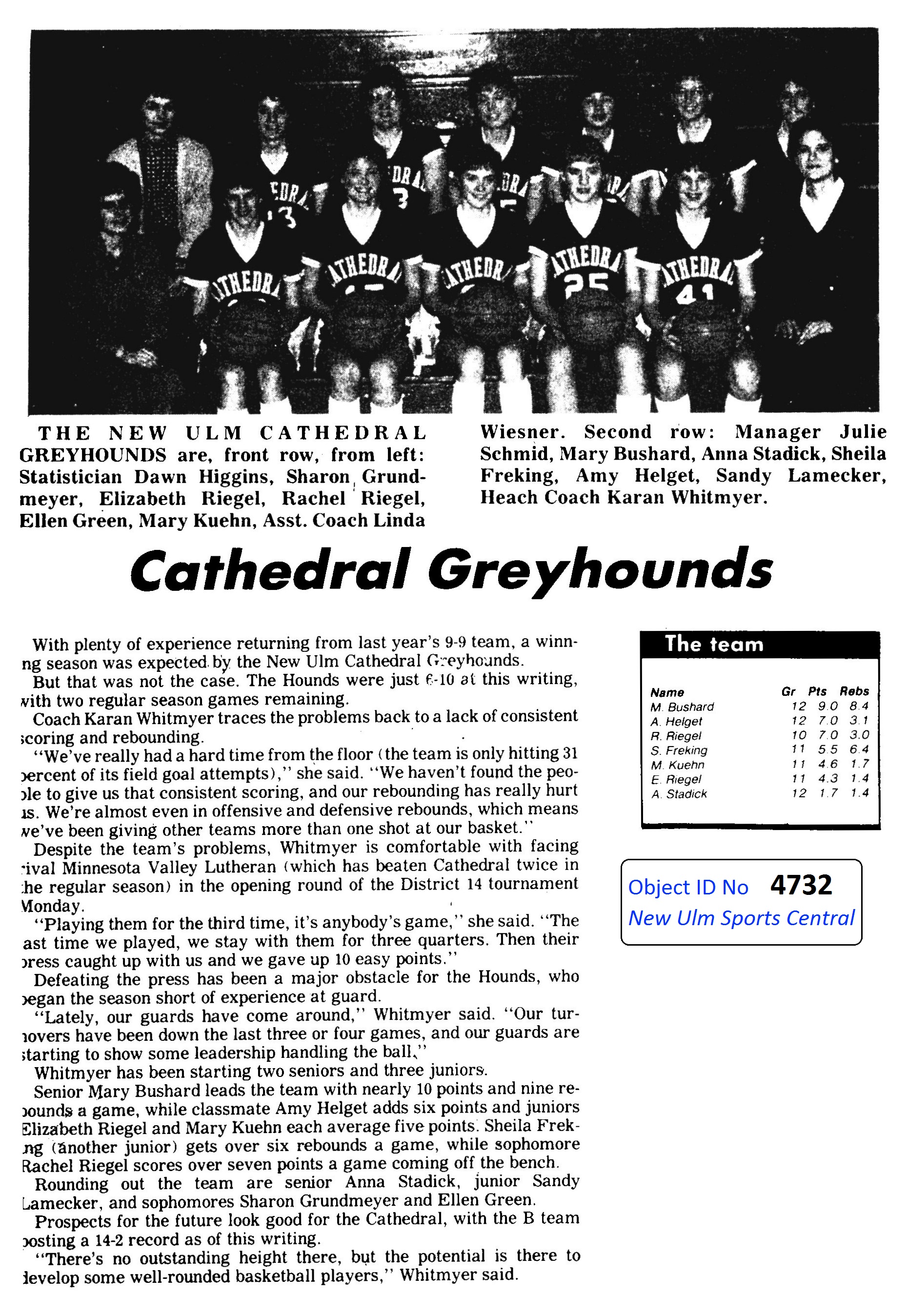 Image # 4732 - 1985-86 Cathedral High School GBB Summary Pre-tournament and regular season summary for Cathedral high school GBBB iun Journal pre-tournament edition. Low quality photo copy of team picture. Original clipping provided by Red Wczawski in girl's basketball notebook and returned to that book. |