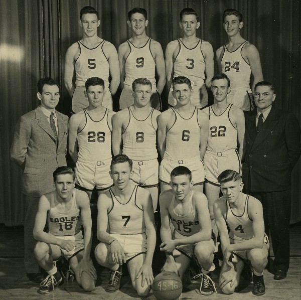 Image # 1906 - 1946 New Ulm High School Basketball Team New Ulm High School basketball team photo for Class of 1946 team. Contributed to NUSC by Patty (Tierney) Schnobrich for class of 1947 65th reunion held in September, 2012. Additional identification required. L-R, front: Jerry Prahl, ____Hermann, Joe Pivonka, Jerry Kraus. Second row: Assistant coach Joe Milino... (Click on the image for a full description) |
