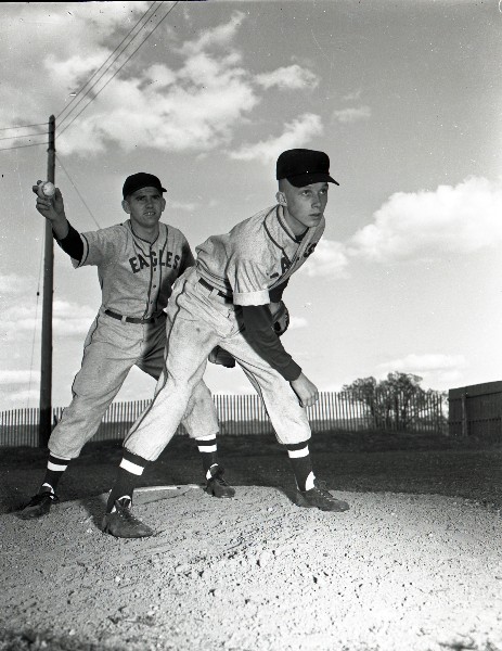 Image # 1616 - No-Hit Pitchers David Ramnes and Roland Rollie Schaper, NUHS Negative shows David Ramnes (front) and Roland Rollie Schaper (back). A second negative available as # 766 reverses positions with Schaper in front. Combines some previous sports negative files 111 and 113. |