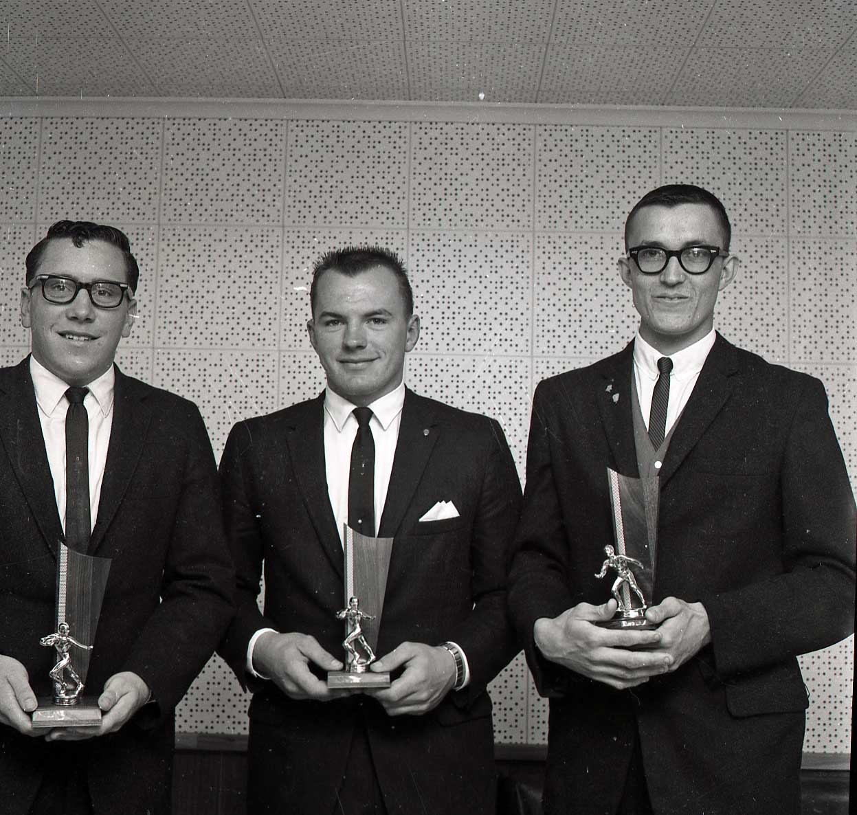Image # 2372 - 1963 Outstanding athletes for KNUJ or Players of Year for NU Journal Three athletes from 212 Conference Hector team and Walnut Grove pictured for 1963. May have been football players of year for either Journal or KNUJ. Includes L-R: Jim Macik, Hector, Larry Radloff, Hector and Leo Baxter, Walnut Grove. Background indicates sound proofing in KNUJ radio studio. |