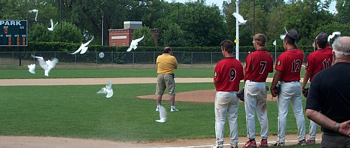 Photo on attachment is release of white doves during ceremonies to start championship game. New Ulm tournament committee made the arrangements with Roger Besemer. Championship games reported.