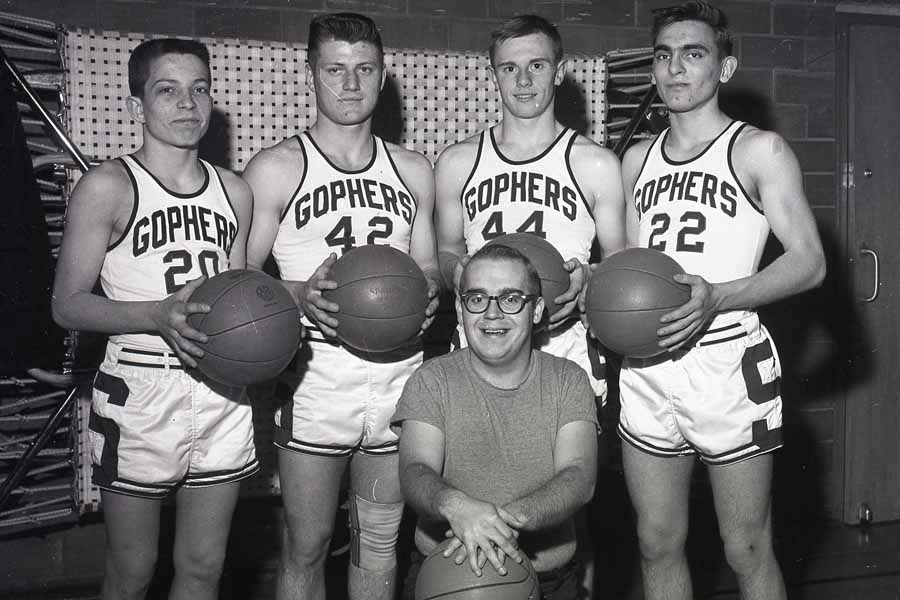 Image # 2193 - 1962-19631967-68 Stewart Boys basketball Group of four players with Coach Val Whipple, Two poses with same people L-R: John Kalenberg, Bert Bauer, Steve Doerr, Dale Bublotz (sp?) Identification, left to right: |