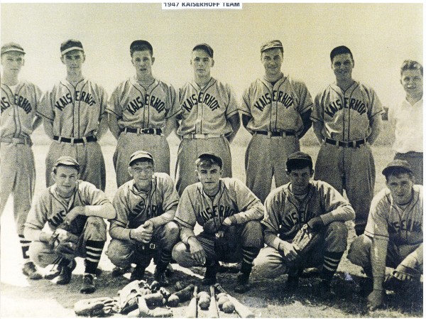 Image # 1642 - 1947 Kaiserhoff Pasture League baseball team In 1947 New Ulm Kaiserhoff sponsored a team in the Pasture League, a league made up of young players in the surrounding rural area (mostly west of New Ulm). Donald J. Veigel was a member of that team. The league then was not associated with the Minnesota Amateur baseball Association. L-R, front, kneeling: Poofy Herzo... (Click on the image for a full description) |