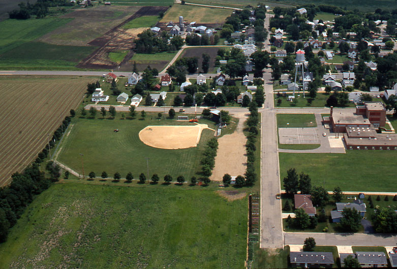 Image # 896 - 1991 Hanska Baseball Park Hanska baseball park slides 1991. Part of series supported by Master Graphics of New Ulm in bid for Minnesota State Hall of Fame. Include\s aerials,ground view and water tower art. |