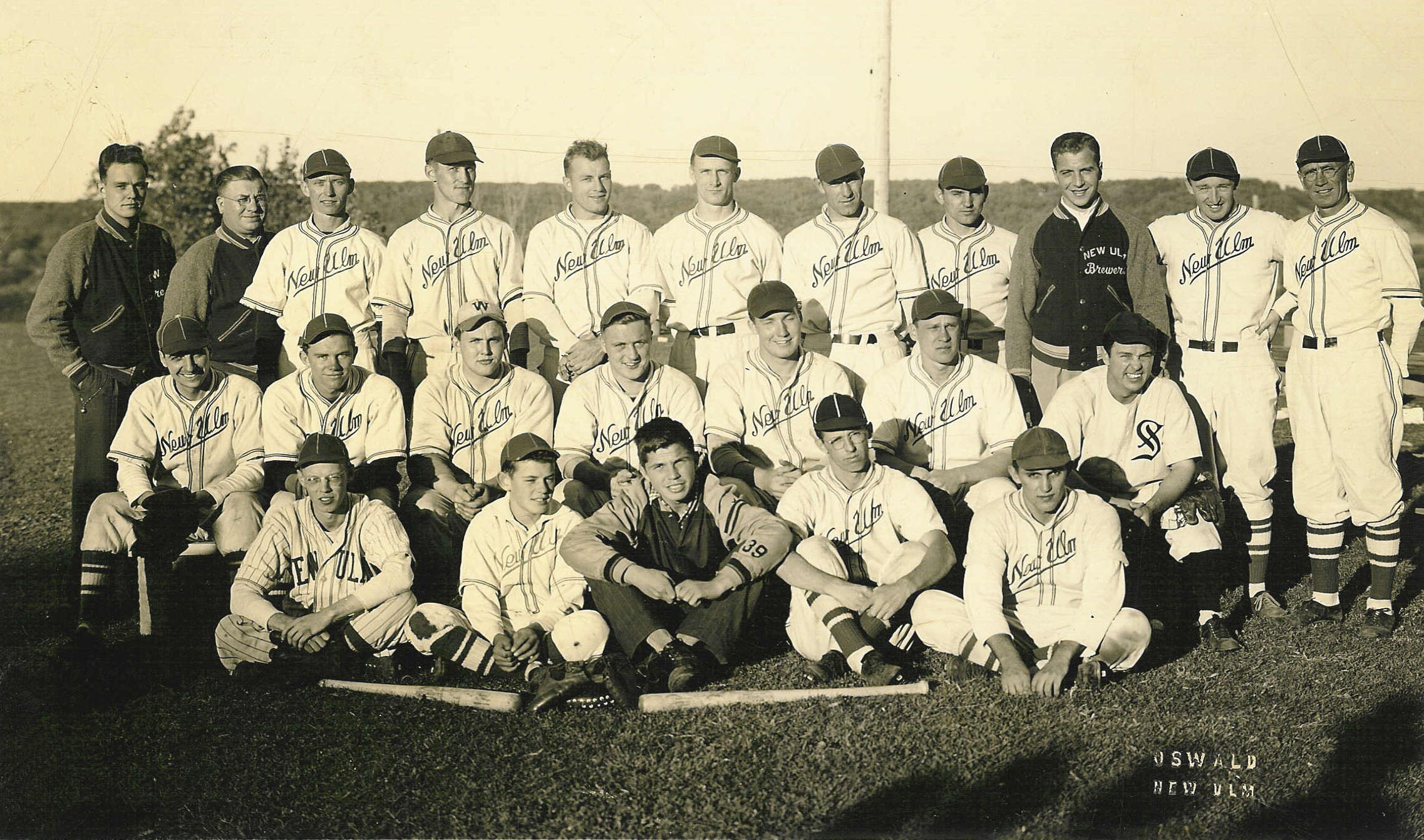 Image # 2335 - 1941 New Ulm Brewers state champion baseball team as one of a collection of New Ulm sports team pictures and individuals on CD created by Jim Aufderheide for NUSC. 1941 New Ulm Brewers baseball team won the state tournament when it was hosted by New Ulm. Archived as object # 2329 in the CD/DVD collection (NUSC file number 2). Identification may be available on duplicate entry of this picture elsewhere. CD made from collection and donated by Jim Aufderheide features 1930 a... (Click on the image for a full description) |