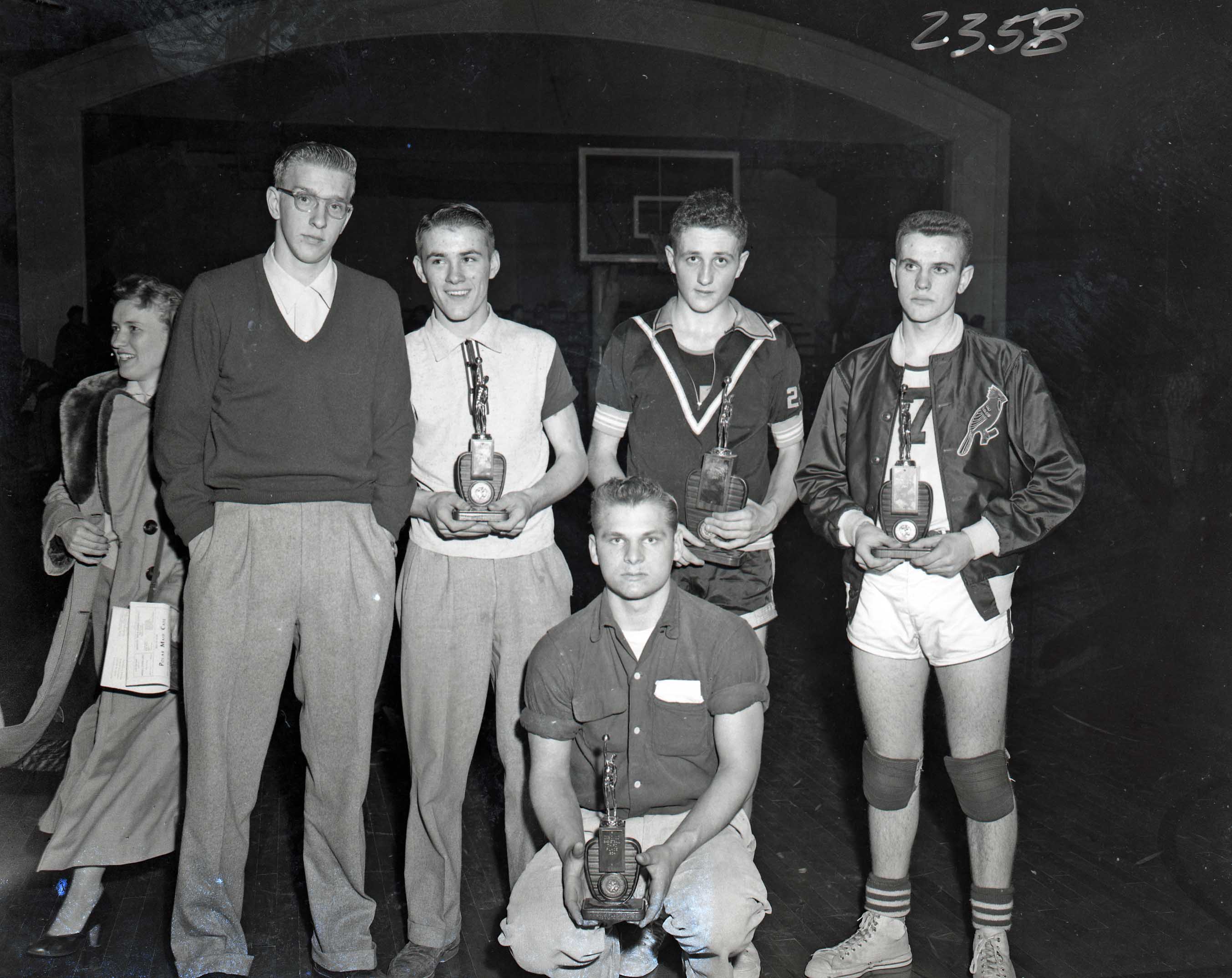 Image # 2358 - 1954 District 10 Basketball tournament miscelalneous post game. Award winners from District 10 tournament which may have included third place game. Kneeling is Dick Sandmann, Morgan. L-R standing: Clint Hammer, New Ulm; Mike Fesenmaier, New Ulm; Ken Lewis, Walnut Grove and Don Cole, Redwood Falls. |