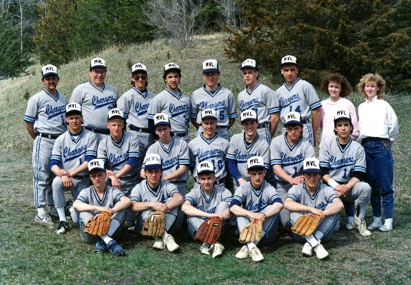Image # 968 - 1989 Minnesota Valley Lutheran baseball team 1989 team color photograph. Also includes offset printing negative in file. L-R, bottom row: Kurt Kimmel, Jon Zimmermann, Damen Kimball, Bryan Tuman, Matt Doering. Second row: Jason Sletta, Bernt Tweit, Tom Kuckhan, Matt Kuster, Brad Retzlaff, Lonny Wilrhette, unidentified. Third row: John Mielke, Ron Briney, rick F... (Click on the image for a full description) |