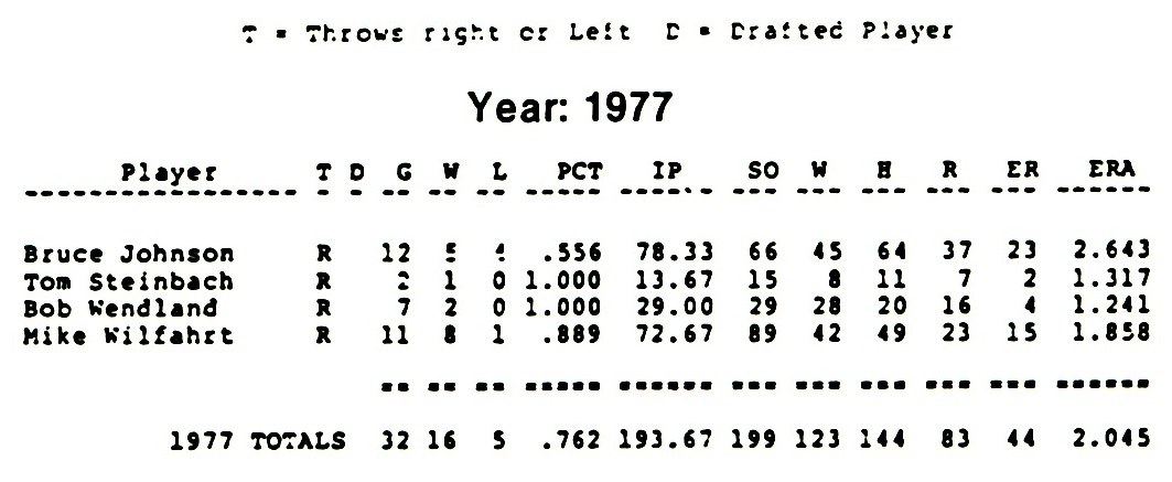 Image # 4559 - 1977 New Ulm Kaiserhoff season pitching stats Annual individual player pitching data in typeset-ready quality for Kaiserhoff baseball starting in 1969. Originally prepared as material Vol. I of New Ulm's baseball history. Hard copy file ready for scanning to digital record. Corresponding season summaries and batting stats are also available. Paste-ups for fur... (Click on the image for a full description) |