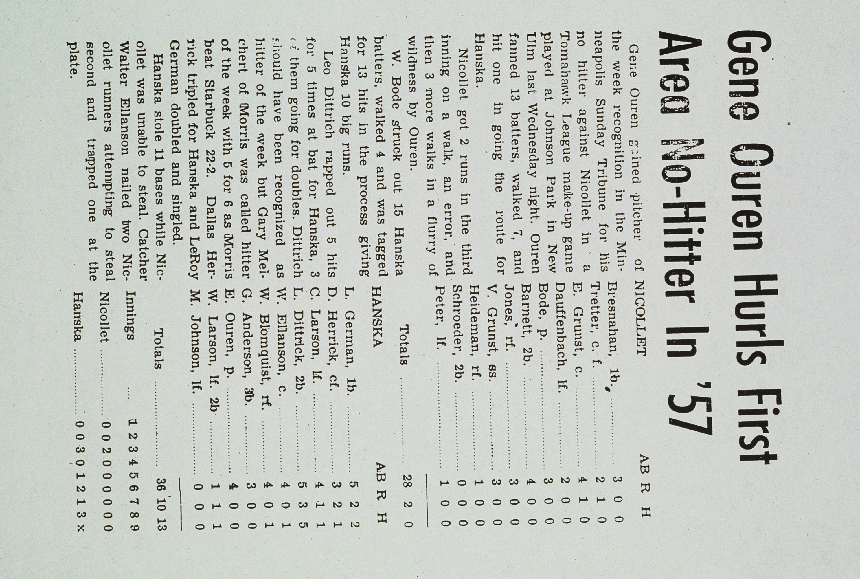 Image # 4039 - Newspaper Article from Hanska Baseball Reunion Collection Slide 098 is an original slide provided by Glen Lee Anderson for Hanska Centennial Baseball reunion. Filed with this info form on CRT website computer or on back-up disk. Original slides copied by Anderson and may have been enhanced by New Ulm Sports Central. |