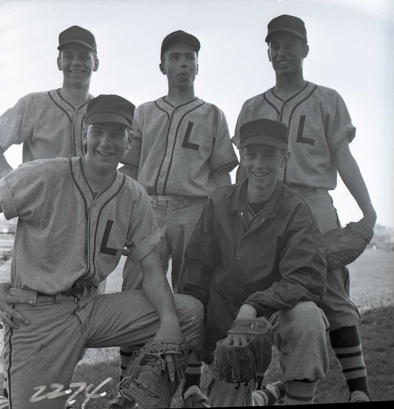 Image # 2274 - 1964 Luther Baseball team. Picture of five players plus some action shots which may have been from a practice session. Needs verification that it is the Luther high school rather than Dr. Martin Luther College. |