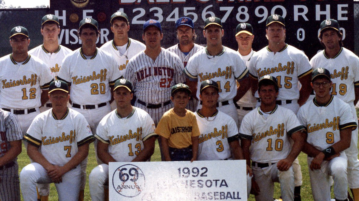 Image # 3980 - Wally Wellman from Hanska Baseball Reunion Collection Slide 049 is an original slide provided by Glen Lee Anderson for Hanska Centennial Baseball reunion. Filed with this info form on CRT website computer or on back-up disk. Original slides copied by Anderson and may have been enhanced by New Ulm Sports Central. Image includes Eldor Wellmann, Wally Wellman. |