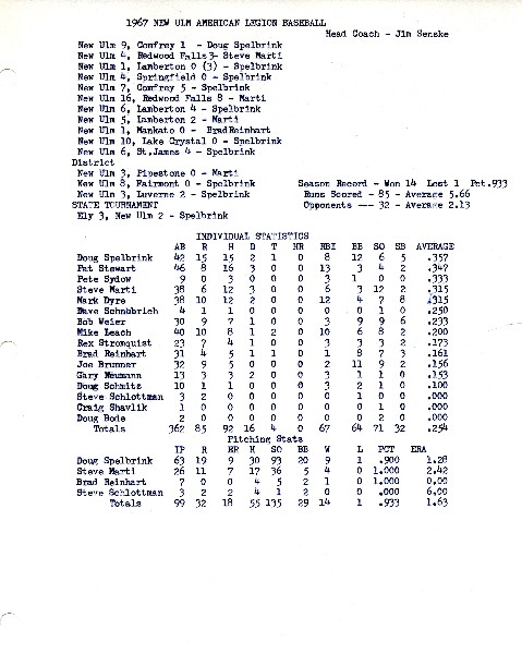 Image # 1440 - 1967 New Ulm American Legion Baseball Season Summary and Individual Statistics 1967 Season Summary and Individual Batting Statistics for the New Ulm American Legion Baseball Team. |