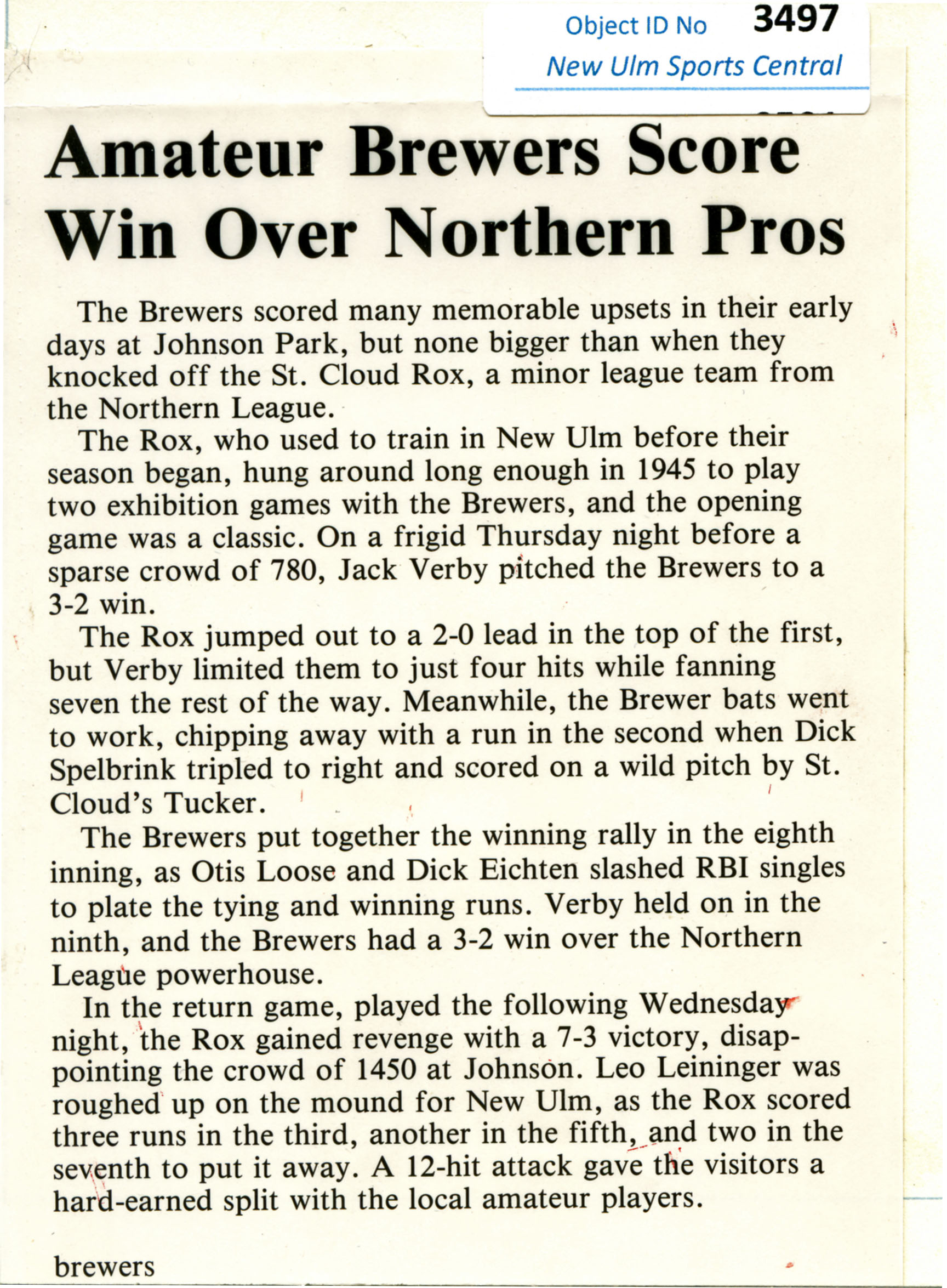 Image # 743 - New Ulm Millers 1966 team picture 1966 New Ulm Millers team picture on four 120mm film exposure. Details required for identification |