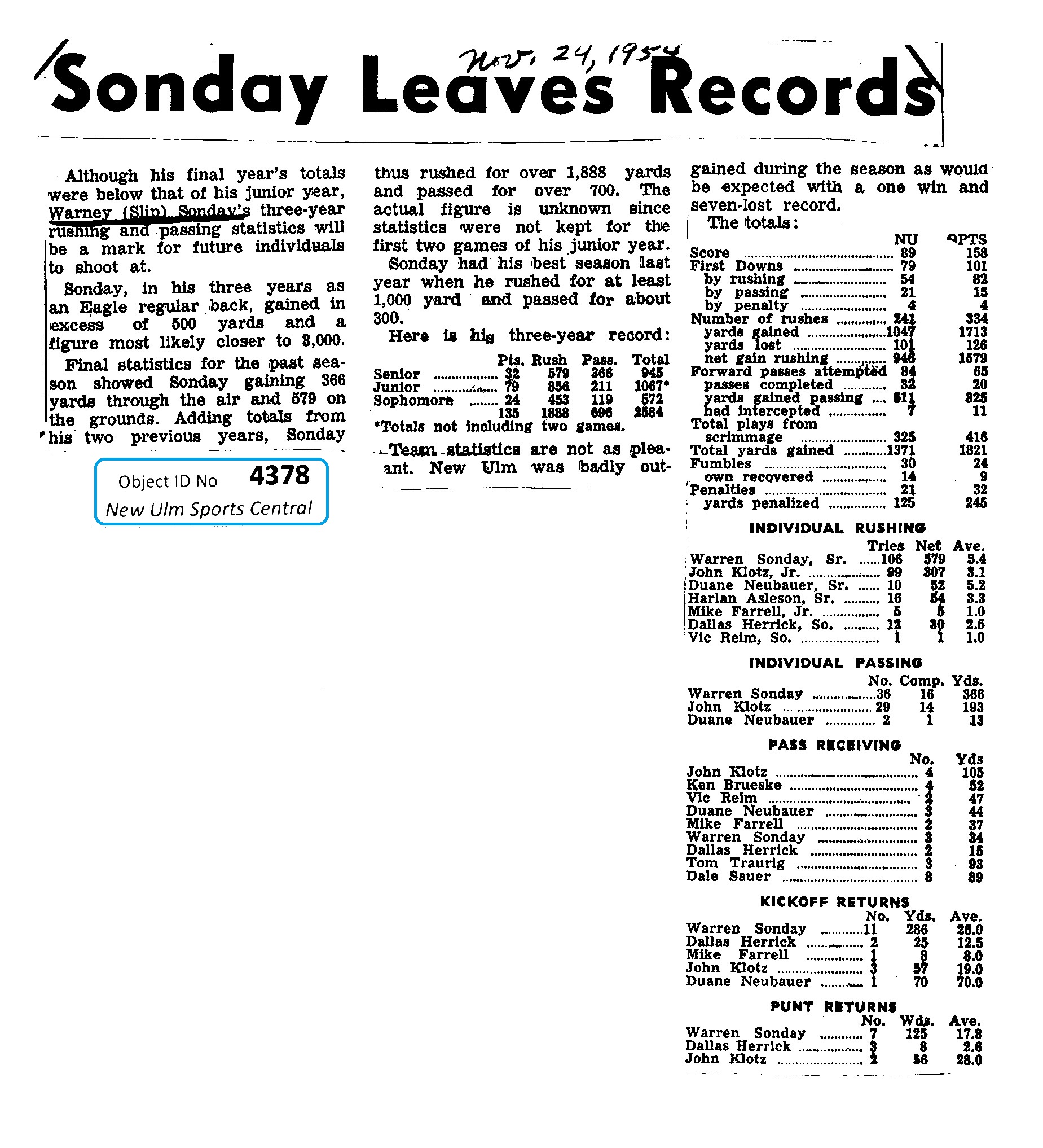 Image # 4378 - 1954 Warren (Slip) Sonday leaves football stats to shoot at Career football stats for Warren Sonday made up an impressive resume even though in his good junior year, stats for the first game were not recorded. His total yards gained left many individual records to shoot at in the future and are reported in this article in the New Ulm Journal at this date. |