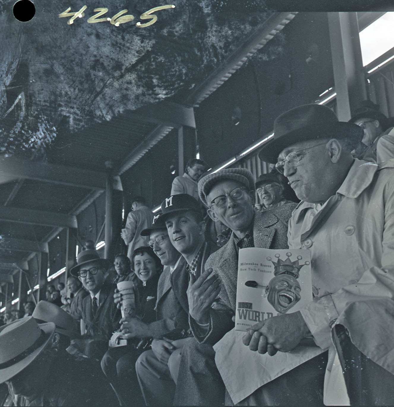 Image # 4265 - New Ulm baseball fans attend Milwaukee's first world series includes contact prints to assist in identification. Two pictures of people from New Ulm sitting in the stands. They had obtained tickets through Carl Wyczawski ho had worked for the Braves in public relations before moving to New Ulm. In he row Wyczawski is at the far left and is wearing a at. Looks like his wife ... (Click on the image for a full description) |