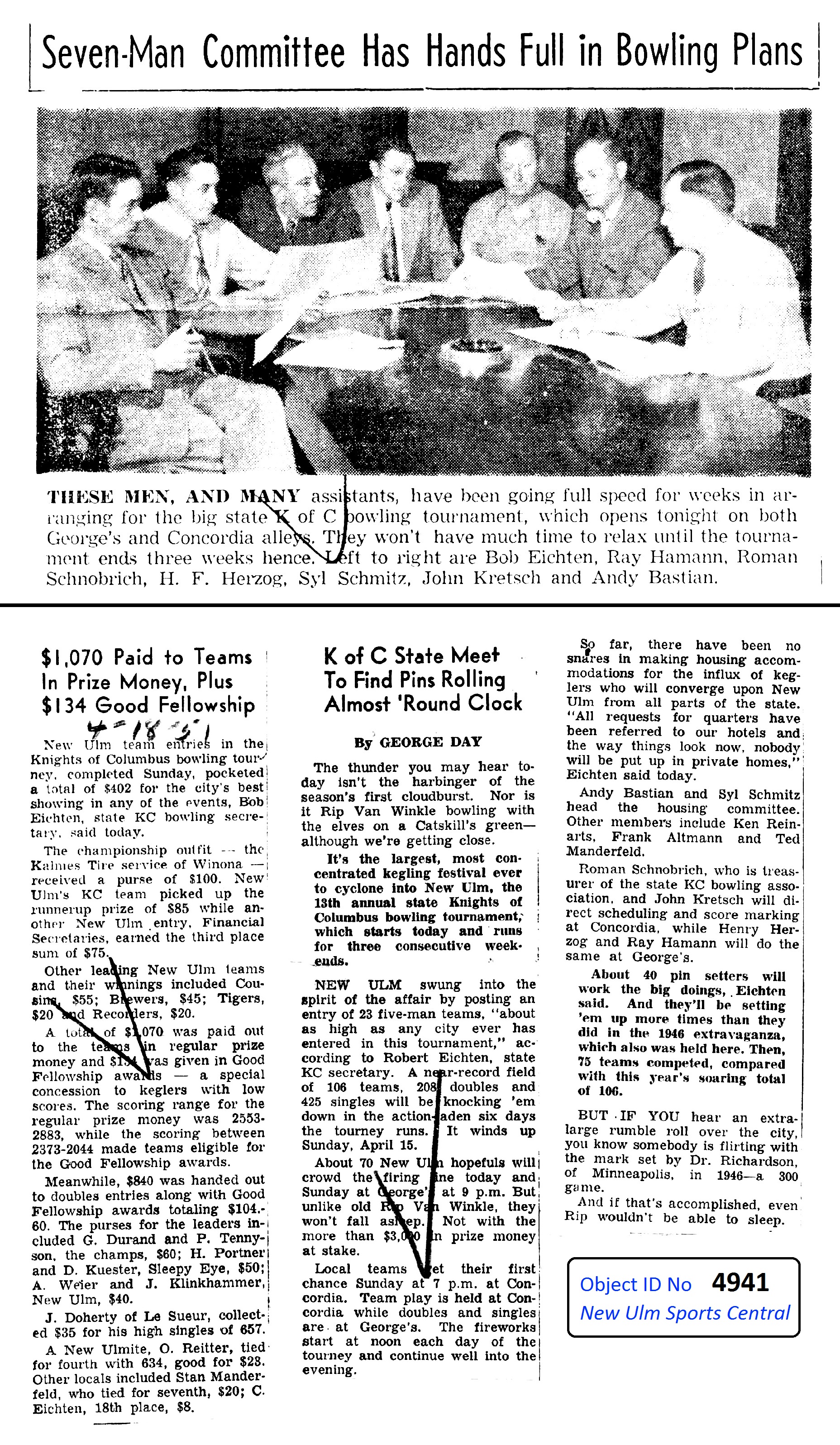 Image # 4941 - 1951 MN State Knights of Columbus Bowling in New Ulm New Ulm hosted the MN State Knights of Columbus Bowling in 1951. Clippings file from New Ulm Journal includes general information, prize money results, and picture of planning committee. The picture includes Bob Eichten, Ray Hamann, Roman Schnobrich, H. F. Herzog, Sylvester Schmitz, John Kretsch, and Andy Bastian. |