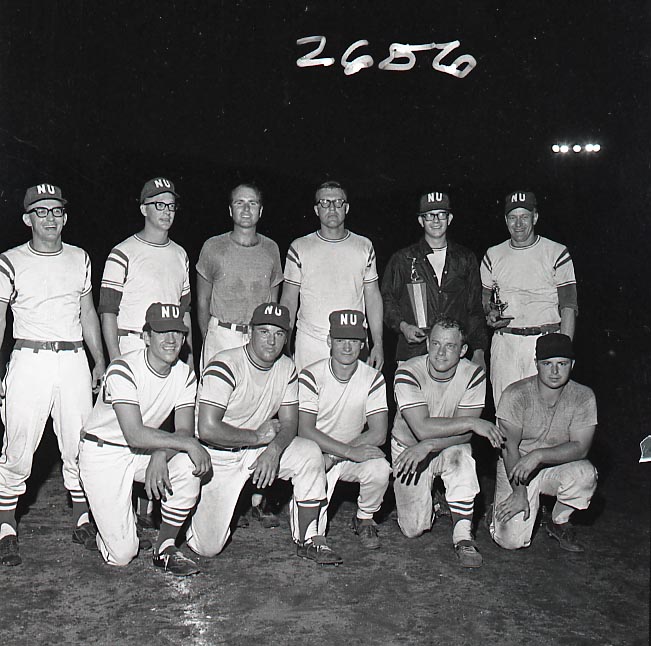 Image # 2656 - Nicklasson Athletic Softball team and Dick Hudson at 1967 tournament Team poses after winning New Um softball tournament championship tournament with Dick Hudson being named the most valuable player. L to R, front: Ken Cordes, Gerald Isensee, Wayne Brudelie, Les Dittrich, Wayne Haefner. Back: Jim Senske, Dick Hakes, Jerry Flanagan, Bill Meyer, Warren Wieland and Dick Hudson. Team's ... (Click on the image for a full description) |