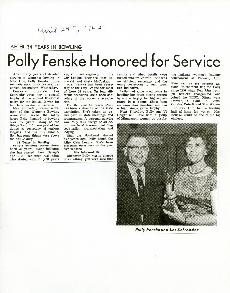 Image # 970 - 1962 Clipping of Polly Fenske Recognized for 34 Years Bowling Photo of Polly Fenske receiving special bowling award from Les Schroeder at Bowl-O-Mat. Clipping from New Ulm Journal. This object includes the newspaper reproduction but as a screened print. Other references and negatives are in 1065 and 9659 |