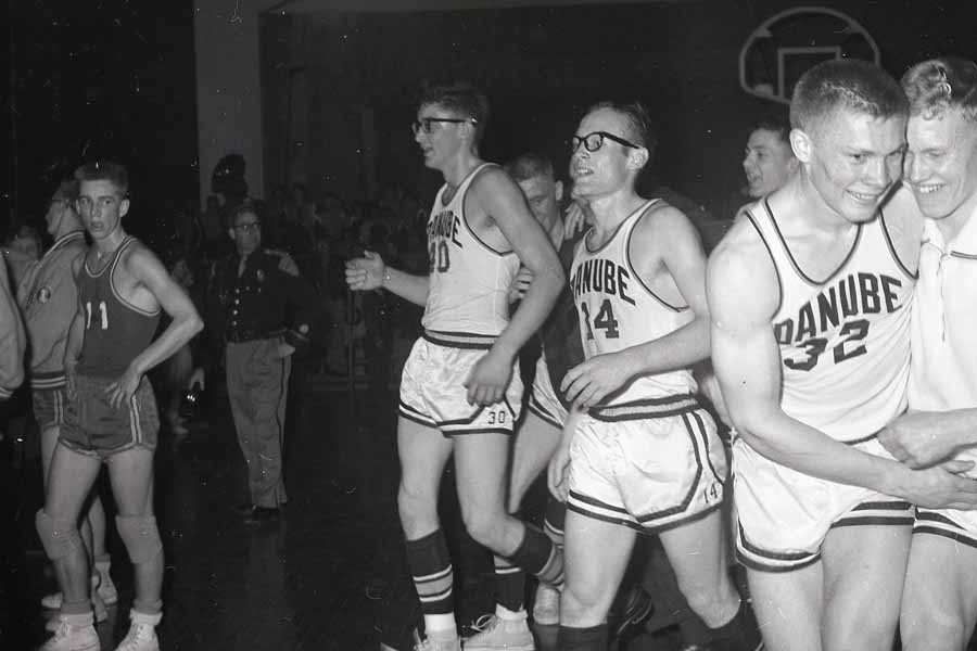 Image # 2067 - 1961 Danube in Regional basketball championship game One of Danube's post game candid photos from 1961 Region III basketball tournament. Happy Danube players rush onto the floor at conclusion of championship victory. Other objects starting with 2063 through related in this approximate series. |