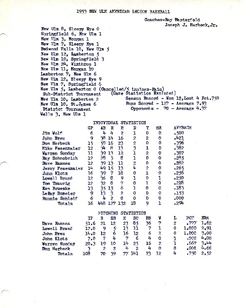 Image # 1426 - 1953 New Ulm American Legion Baseball Season Summary and Individual Statistics 1953 Season Summary and Individual Batting Statistics for the New Ulm American Legion Baseball Team. |