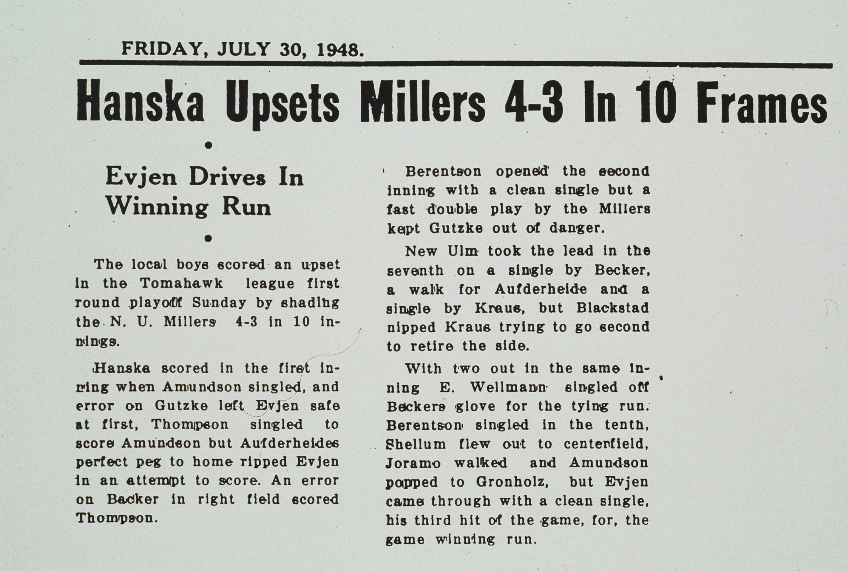 Image # 3961 - Newspaper Article from Hanska Baseball Reunion Collection Slide 034 is an original slide provided by Glen Lee Anderson for Hanska Centennial Baseball reunion. Filed with this info form on CRT website computer or on back-up disk. Original slides copied by Anderson and may have been enhanced by New Ulm Sports Central. |