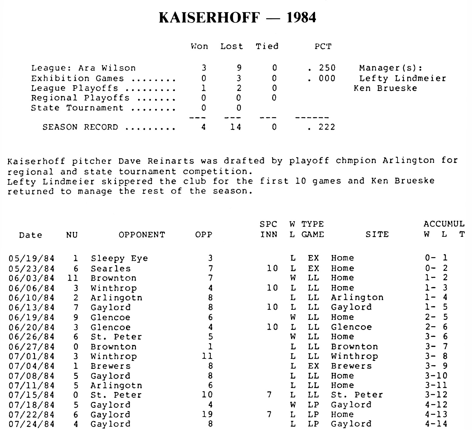 Image # 4546 - 1984 New Ulm Kaiserhoff season baseball summary Season record of games with league standings for Kaiserhoff baseball starting in 1969. Researched by Ron Reinhart and Herb Schaper for 1989 Johnson Park Anniversary book. Printed from data entered into CP/M computer by Brad Schaper for anniversary book. League affiliations are shown on the individual annual report... (Click on the image for a full description) |