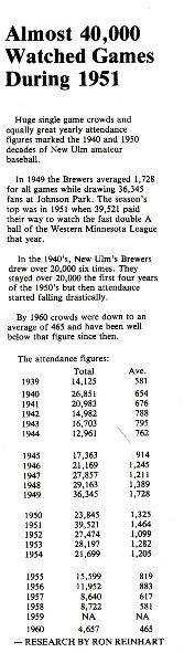 Image # 830 - 1951 Attendance was almost 40,000 for Brewers From 1989 Johnson Park Anniversary booklet, Ron Reinhart research on attendance show almost 40,000 attended Brewer games that season. Article documents attendance records from 1939 through 1960 including the 10-year-period of 1945 through 1954 when crowds averaged 1,000. In 1951 average attendance as almost 1,500. |