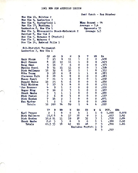 Image # 1434 - 1961 New Ulm American Legion Baseball Season Summary and Individual Statistics 1961 Season Summary and Individual Batting Statistics for the New Ulm American Legion Baseball Team. |