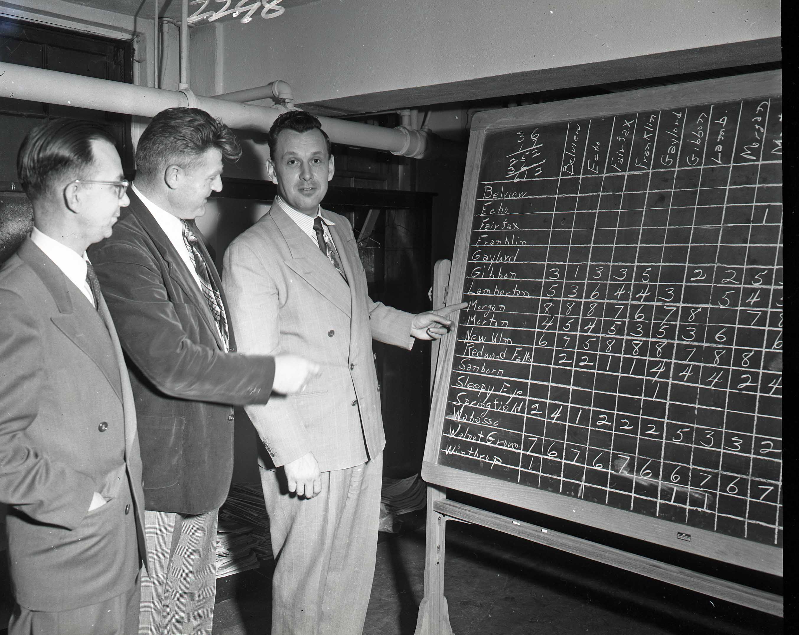 Image # 2298 - 1954 District 10 Committee makes pairings for basketball tournament District 10 administrators check the seeding ballots to make the pairings for the 1953-54 district 10 basketball tournament. Left to right identification appreciated if you will email nusc@newulmtel.net |